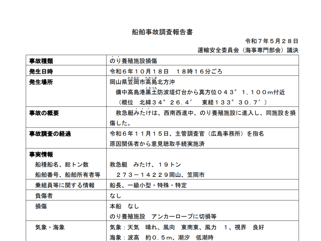 この報告書には、事故の発生日時や場所、関係する船舶名、原因、再発防止策などが文章形式で記載されています。