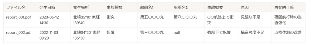 • 発生場所:海上事故は住所が存在しないため、報告書に記載された緯度経度を直接抽出